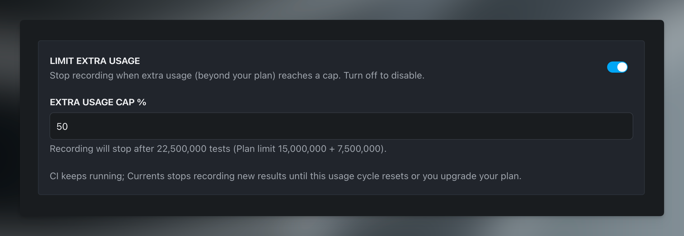 Organization admins can now set a hard cap on how much extra usage is allowed beyond your plan limit before Currents pauses recording new results.